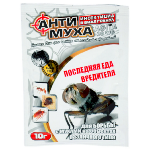 Антимуха — безопасный для людей инсектицидный препарат быстрого действия против бытовых насекомых: мух, пауков, муравьев, моли и т.д. Можно применять в помещениях, где содержатся животные (коровник, свинарник, птичник и др.). Комбинированный состав обеспечивает эффективное действие препарата против летающих и ползающих насекомых (мухи, муравьи, клопы, блохи и др.). В зависимости от применения используется в виде раствора, который наносится в нужных местах. Гранулы используются в чистом виде, для разбавления раствора, а также для приготовления приманок в зависимости от обрабатываемой поверхности. В состав средства входит высокоэффективный инсектицид, который мгновенно уничтожает насекомых и уже на третий день после использования вас уже не будут беспокоить назойливые мухи.