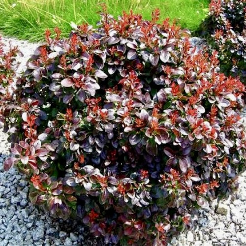 Барбарис Тунберга Багатель очень красивый медленнорастущий карликовый многоствольный кустарник шарообразной формы высотой около 40 см. имеет оригинальный окрас листьев в багряно-красный цвет с медным отливом.