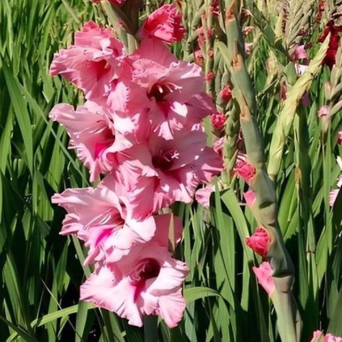 Гладиолус Cilesta – это изысканный сорт, очаровывающий своим нежным розово-белым окрасом. Его элегантные цветки собраны в длинные соцветия, создавая нежную и воздушную композицию. Высота растения обычно составляет 100-120 см, хотя в благоприятных условиях может достигать 150 см. Благодаря своей величественности, гладиолус эффектно смотрится как в цветниках, так и в букетах.