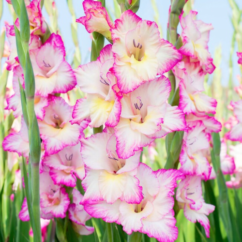 Гладиолус Priscilla — изысканный сорт с необычайно нежной и яркой расцветкой. Его крупные цветы сочетают белоснежные и розовые оттенки с малиновой каймой и бархатистой текстурой лепестков. В центре каждого цветка заметно мягкое жёлтое пятно, что придаёт соцветиям особую выразительность. Благодаря высокой декоративности, этот гладиолус идеально подходит для цветников и срезки, а один стебель с распустившимися цветами может стать основой эффектного букета.
