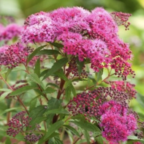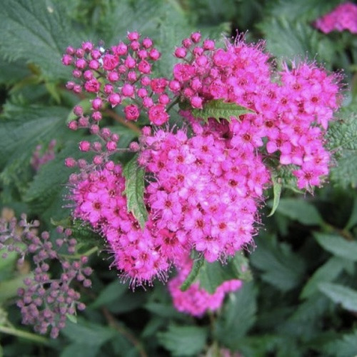 Летом, с июня по июль, спирея Криспа покрывается нежными розово-лиловыми цветами, собранными в густые соцветия диаметром до 5,5 см. Эти соцветия украшают растение на протяжении 1,5-2 месяцев, радую глаз до первых заморозков. Цветы появляются на побегах текущего и прошлого года, создавая эффектный контраст с насыщенной зеленью листвы.