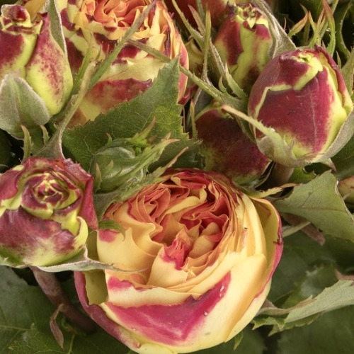 Бутоны плотные, махровые, диаметром до 8 см, состоят из 45–60 лепестков. В соцветиях формируется по 5–7 цветков. Цветок долго сохраняет форму и хорошо держится на кусте даже после дождя, что делает розу Вулканика отличным выбором как для сада, так и для среза. Аромат легкий, нежный, с фруктовыми нотками.