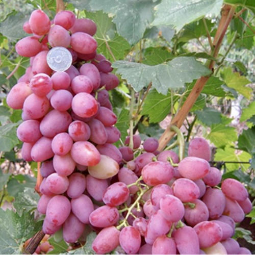 Грозди крупные, конические, средней плотности, с массой 800–1000 г (отдельные экземпляры до 1,5 кг), не склонны к горошению. Ягоды вытянутой формы, крупные, массой 8–10 г, размером до 25×22 мм, розового цвета с мускатным ароматом. Мякоть средней плотности, сочная, с приятным мускатным вкусом, кожица средней толщины, практически не ощущается при еде. Иногда в ягоде может присутствовать пара семян.