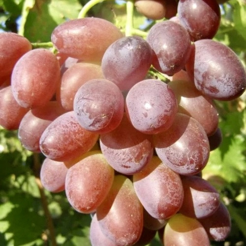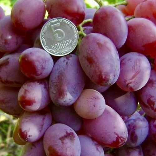Грозди винограда цилиндроконические, средней плотности или рыхлые, весом в среднем 700–800 г, но на сильных кустах могут достигать 1,5–2 кг. Ягоды удлинённо-овальные, крупные, в среднем 10–14 г, размером около 38,5 × 23,1 мм. Окраска — насыщенно тёмно-розовая или красная, без перехода в фиолетовый оттенок, поверхность покрыта лёгким пруиновым налётом, что делает грозди особенно нарядными.