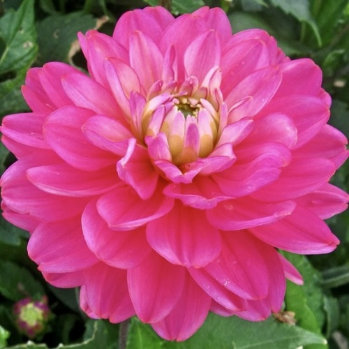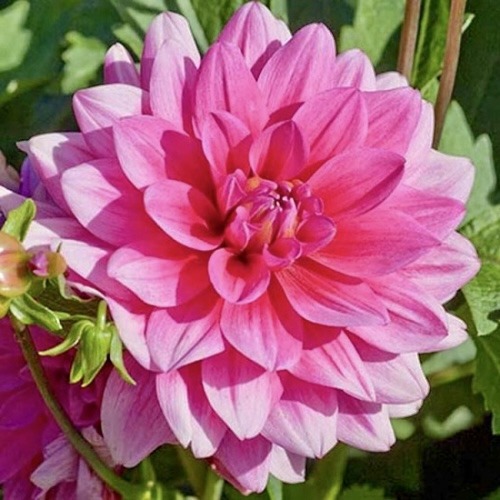 Цветки георгины Melody Pink Allegro махровые, крупные, достигают 15-17 см в диаметре. Особенностью этого сорта является его двухцветное окрашивание: насыщенно-розовые лепестки с нежным кремовым оттенком в центре. Листья темно-зеленые, густые, создающие красивый контраст с яркими соцветиями. Растение зацветает в начале лета и радует непрерывным цветением до первых заморозков. Отцветшие бутоны рекомендуется удалять, чтобы продлить период обильного цветения.