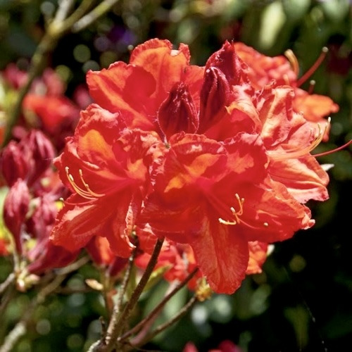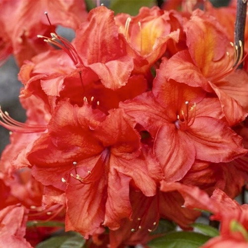 Навесні та влітку рослина прикрашена насичено-зеленим листям, яке восени перетворюється на вогняну гаму – від червоного до оранжево-жовтого. Основна окраса рододендрона Феєрверк – його великі квіти до 8 см у діаметрі. Вони зібрані у щільні суцвіття й мають надзвичайно ефектне забарвлення: яскраво-червоне з теплим оранжевим відтінком. Цвітіння відбувається у травні – на початку червня й справляє враження справжнього феєрверку барв у саду.