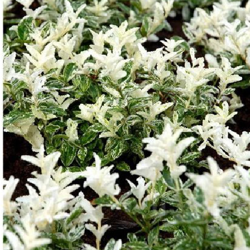 Бересклет сорт Арлекін - декоративний багаторічник, з строкатим вічнозеленим листям.Кущ щільний складається з численних піднятих вгору пізніше пагонів, що лежать, виростає до 40 - 50 см заввишки, діаметр до 60 см. Лист супротивний, еліптичний, загострений, світло-зелений з білими розтинами або нерівномірними точками, молобі практично білі. Гілки при зіткненні із землею легко вкорінюються, створюють декоративні вічнозелені килими, за сприятливих умов швидко розростаються і можуть підніматися на стовбури дерев, шорсткі стіни досягаючи до 1,5 метрів висоти. Квіти дрібні, зеленувато-жовті суцвіття. Цвіте у червні-липні.Віддає перевагу сонячним ділянкам, півтіні. Добре росте на родючих, легких ґрунтах.