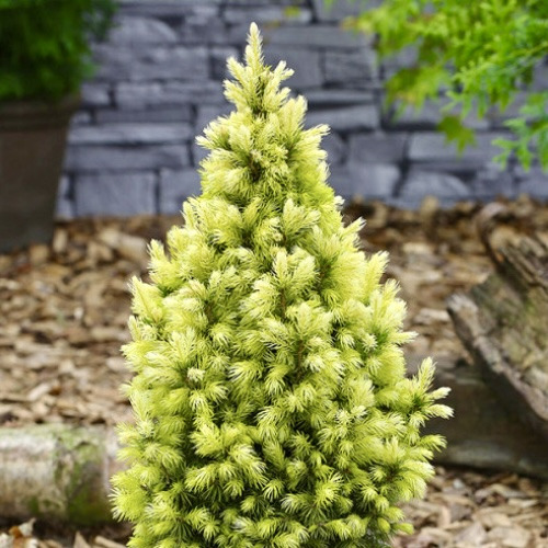 Ялина канадська Daisy's White (Picea glauca Daisy's White) – декоративна карликова форма ялини з надзвичайно привабливим кольором молодої хвої, що змінюється в залежності від сезону. Ця хвойна рослина повільно зростає, збільшуючись всього на 3-4 см на рік, що робить її ідеальним вибором для малих садів, альпінаріїв та декоративних композицій. Доросла ялина досягає висоти близько 2 м і ширини до 1 м, формуючи конічну, компактну крону з гострою верхівкою.