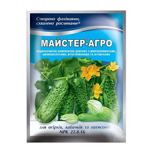 Високоефективне комплексне добриво для огірків, кабачків і патисонів, містить необхідний набір макроелементів (азот - 22%, фосфор - 8%, калій - 16%) і мікроелементів в хелатній формі, а також фітогормонів і вітамінів.