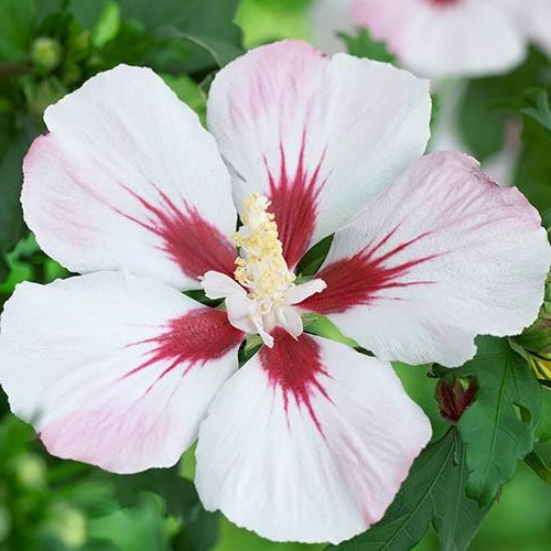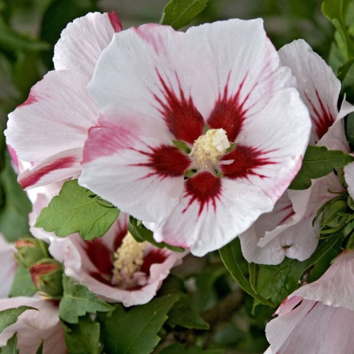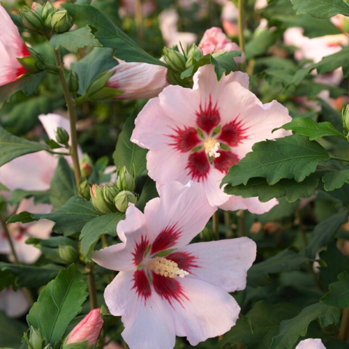 Гібіскус "Hamabo" є листопадним швидкозростаючим чагарником. Жовто-біле (іноді зелене) молоде листя розпускається пізно, яйцевидної форми, листки розташовані почергово. Цвітіння відбувається в серпні - вересні, квітки рожеві (смугасті) великі, прості (9-10,5 см в діаметрі), з плямою посередині (темно - червоною). Це рослина дуже світлолюбна, але переносить і невелике затінення.