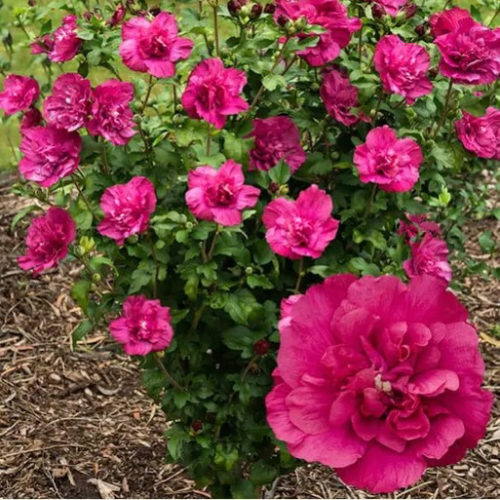 Квіти гібіскуса "Magenta Chiffon" є його головною прикрасою. Вони махрові, насичено темно-рожевого або червоного кольору, досягають діаметру до 10 см і мають напівмахрову структуру. Цвітіння рясне і тривале – з середини літа до кінця вересня. Кожен кущ рясніє квітами, створюючи яскравий і барвистий вигляд у саду.