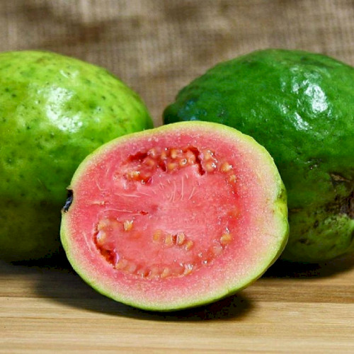 Листя у гуави щільні, темно-зеленого кольору, схожі на листя кави. Вирощують гуаву заради смачних і корисних плодів. Плоди червоного кольору, від 2.5 до 4 см в діаметрі, зовні нагадують плоди глоду. Гуава цінується, крім своїх високих смакових якостей, за високий вміст вітаміну С, якого в плодах гуаяви в кілька разів більше, ніж в цитрусових рослинах, містять велику кількість бета-каротину, багаті плоди і на вітаміни групи В і вітамін Р, дуже ароматні. Вживаються в свіжому вигляді, і вигляді джемів, для прикраси десертів, для приготування соків. Незрілі плоди багаті на пектин. Сік гуаяви застосовують для лікування хвороб серця і астми.