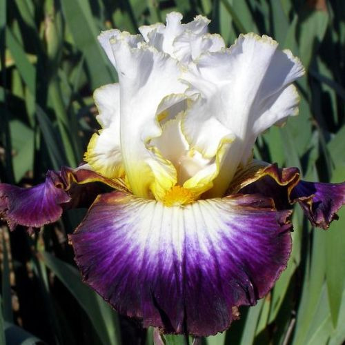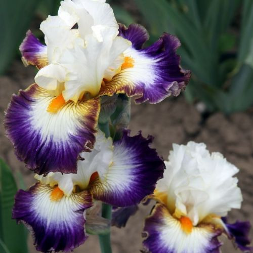 Борідковий ірис Даунтаун Мен – квітка, що належить до гофрованого виду. Рослина середньої висоти (90 см), не виділяється серед інших рослин цього роду. На одному кущі може розвиватися одразу декілька квітконосів. Зелені листочки мають продовгувату форму, бутони доволі великого розміру, мають більше, ніж 15 см у діаметрі. Верхні пелюстки біло-фіолетові, а фоли – фіолетові, наділені борідками золотисто-помаранчевого відтінку. Суцвіття даруватимуть радість на початку літа. Виділяють ніжний аромат.