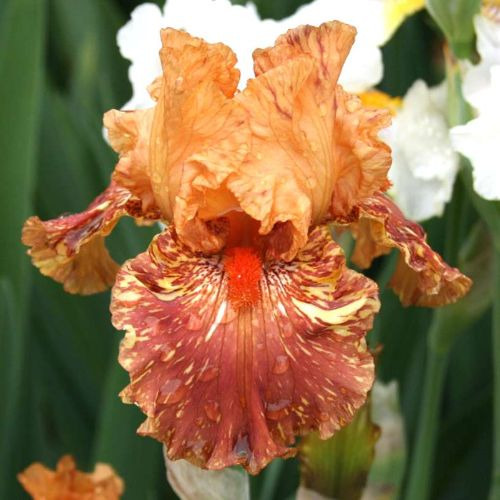Пишні квітки цього іриса ярко-оранжевого кольору з кремовими прожилками у водопадах та яскравою мандариновою бородою.