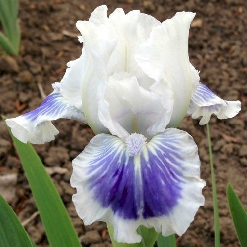 Ірис "Big Blue Eye" - льодово-білі, Фоли - синьо-фіолетові з білою облямівкою і лавандово-білими вінками навколо білосніжних борідок.
