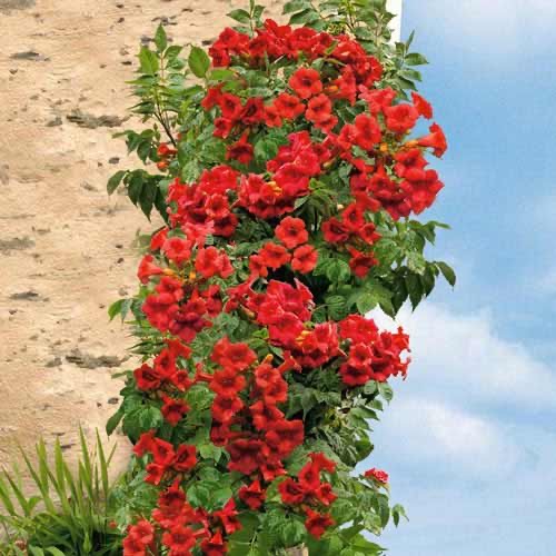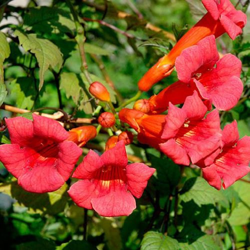 Кампсис дереться за допомогою чіпляються корінців, але в молодості потребує підв'язування, обвиває своїми ліанами різні огорожі, опори, стовпи, впевнено чіпляється корінцями за стіни і формує пишну і густу шапку з листя. Квіти червоного кольору, трубчасті, без запаху, утворюють короткі волотисте суцвіття. Рясно цвіте і яскраві квіти, вигідно виділяються на зеленому тлі листя. Молоді пагони рослини досить стійкі до несприятливих факторів зовнішнього середовища. Ліани сильні з щільною зеленою корою з віком дерев'яніють і набувають буро-коричневий колір. На стовбурах в междоузлиях утворюються повітряні корені, якими кампсис "Flamenko" вміло чіпляється за поверхні і підіймається вгору. Кампсис вирощується у відкритому грунті. У середині травня в підготовлений грунт висаджуються живці, відводки або кореневі відростки, поливаються і мульчують. Кампсис червоний "Flamenko" краще висаджувати на південних, добре освітлених ділянках. Молоді саджанці зацвітають на 2-3й рік. Витончені квіти вважаються чудовим медоносом.