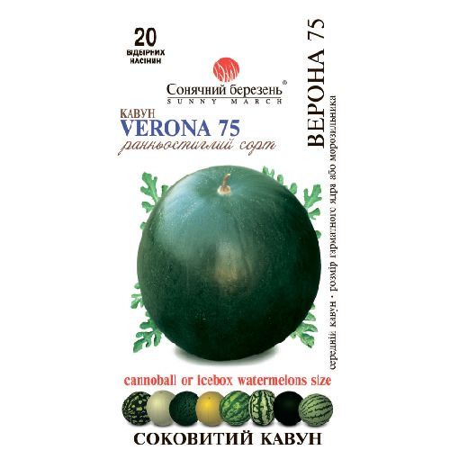 Дуже привабливий сорт із круглими плодами, що дозрівають у другій половині літа. Вони важать близько трьох кілограмів. Шкірка чорно-зелена, тонка, але досить міцна для транспортування. М'якуш темно-червоний, дрібнозернистий і дуже солодкий, насіння світло-коричневе, майже біле. Це добрий сорт середнього розміру для невеликих городів, пристосований до прохолодного клімату. Дозріває за 75 днів.