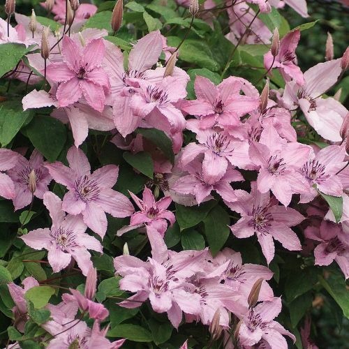 Клематис «Хеглі Гібрид» - стійкий, не надто швидко зростаючий сорт, зі світло-рожевими квітками і шоколадно-коричневими тичинками. Рясноквітнучий в липні-вересні. Ідеальний для вирощування біля огорож, стін, альтанок, решіток. Може плестися по натуральним опорам, напр. невеликим деревам і кущам. На дуже сонячних місцях цвіте коротше, а квітки бліднуть.