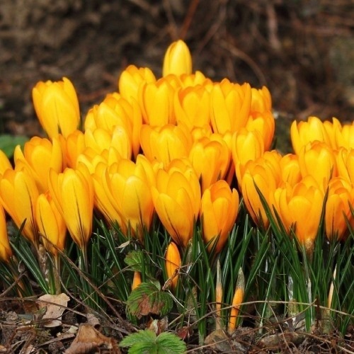 Найбільш ефектно жовтий крокус виглядає групою, а також контрастуючи з квітучими картинами, наприклад, бузкового кольору.
