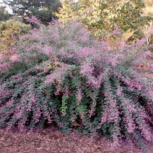 Листя цієї рослини - блакитно-зелена, а восени вона набуває жовтуватого відтінку, створюючи красивий контраст з яскравими квітами. Листя трійчасте, з ніжною текстурою, і шовковисто-опушене з нижньої сторони. Квітки рослини дрібні, рожево-пурпурові, зібрані в суцвіття. Цвітіння починається наприкінці серпня і продовжується до перших заморозків, створюючи цікавий декоративний ефект в осінньому саду.