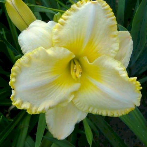 Сорт Спейскост Скрамблед - світло-жовто - біжевого кольору з екстремально гофрованою жовто-золотистою облямівкою. Квітка округлої і відкритої форми - велика, з важким опуким гофруванням. Напіввічнозелений, тетраплоїдів.