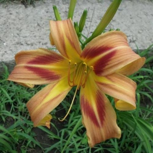Витончена квітка павукоподібної форми яскравого, оранжево-динного кольору з червоною очною зоною і золотим горлом.