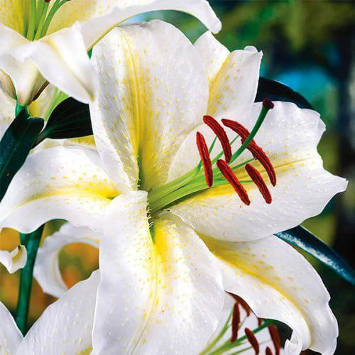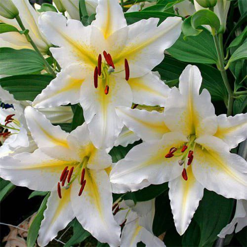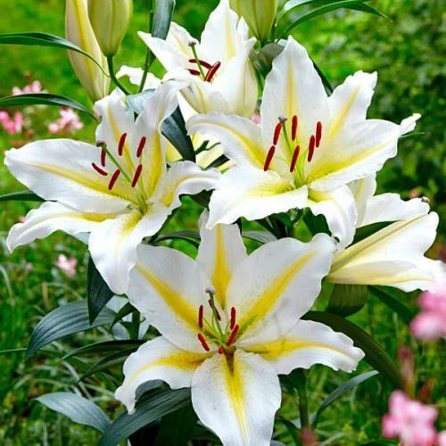 Лілії орієнтальні (східні) Baferrari відносяться до гібридних різновидів сімейства лілійних, купити цибулини можна для прикраси саду, а також для створення букетів. Квітки лілії повернені в сторони, мають білий колір з контрастною жовтою лінією по центру і червоно-коричневими пильовиками. Рослина статна з темно-зеленим листям, які красиво відтіняють білосніжні квіти Баферрарі.