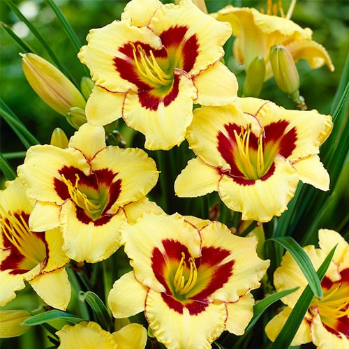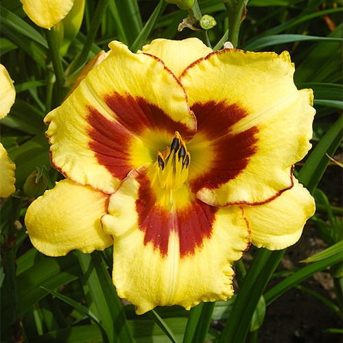Яскраві двоколірні квітки цього сорту мають пелюстки різної ширини: три верхні пелюстки ширші, ніж нижні. Пелюстки забарвлені в лимонно-жовтий колір. По центру квітки розташовано велике бордове вічко, яке переходить в жовто-зелений зів. Краї витончено вигнутих пелюсток злегка хвилясті, з тонкою бордовою облямівкою по краю. Інші особливості сорту: