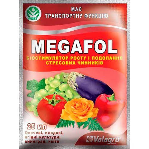 Препарат використовується для подолання стресових факторів рослин, таких як град, посуха, заморозки. Засіб виготовлений з рослинної сировини і є повністю безпечним для рослин та корисних комах. До складу мегафолу входять амінокислоти, які швидко виводять рослину зі стресу, відновлює фотосинтез і збільшує врожайність.