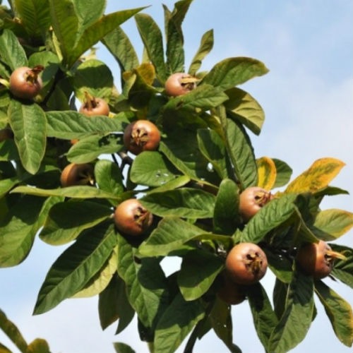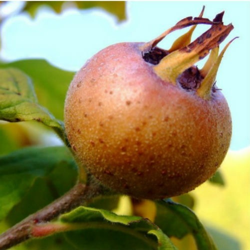 Плоди рудувато-коричневі, округлі, з щільною шкіркою, діаметром 3-5 см. М'якуш солодкий, трохи кислуватий, терпкий з яблучно-айвовим смаком. Формою схожі на ягоди шипшини. У м'якоті знаходиться 5 кісточок, що містять насіння. Плоди вживають перезрілими або підмороженими, коли вони стають м'якими і солодкими.