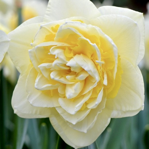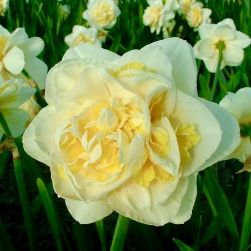 Нарцис Lingerie — вишуканий махровий сорт, що поєднує ніжність та об’ємність у кожній квітці. Його пелюстки нагадують легке мереживо: білосніжні зовнішні пелюстки створюють чистий фон, а центр прикрашений кремово-жовтими й ледь рожевуватими відтінками. Така багатошарова структура робить суцвіття особливо пишними та декоративними.