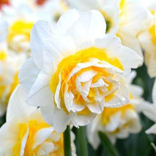 Нарцис Дабл Стар - махровий сорт, кілька рядів пелюсток, які ніби утворюють дві білі зірочки! У центрі, за рахунок пишних скуйовджених частин коронки, створюється жовте сяйво. Відмінно поєднуються з яскравими тюльпанами і гіацинтами. Висота нарциса 45 см - 50 см.