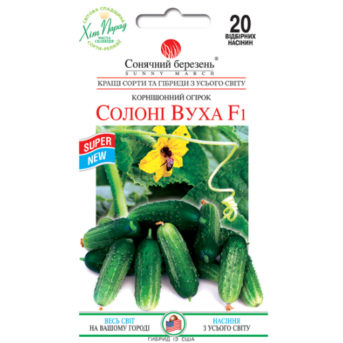 Середньостиглий, бджолозапильний гібрид, переважно жіночого типу цвітіння, від повних сходів до першого збору 50-55 днів. Зеленець циліндричний, горбкуватий, короткий (7-9 см) зі світлими смугами на 2/3 плода, особливо добрий для консервування. Смакові якості високі. Спеціально створений для переробки (засолювання, маринування). Посів на розсаду в торф'яні горщики або постійне місце. Насіння починає проростати при 1 13...15°С. Тепло-і вологолюбний, віддає перевагу освітленим, захищеним від холодних вітрів місцям з родючим легким грунтом. Оптимальна температура зростання: 25...30°С. Для відкритого ґрунту. Догляд: полив теплою водою, раз на 10 днів підживлення, прополювання, розпушування. Урожай збирають у міру дозрівання плодів.
