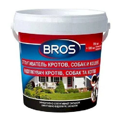 Відлякувач кротів, собак та котів Bros 450 мл ефективно відлякує запахом: кішок і собак, а також кротів. Засіб має унікальну формулу запаху, який особливо неприємний для тварин. Засіб має вигляд торфосуміші, тому його можна непомітно використовувати на газонах, у квітниках й т. ін. Ефективно діє відразу після застосування впродовж 3 тижнів, попри погодні умови — не втрачає своїх властивостей навіть після дощу. Препарат безпечний — може бути використаний у місцях, де грають діти, а також на грядках, клумбах, у садах і газонах.