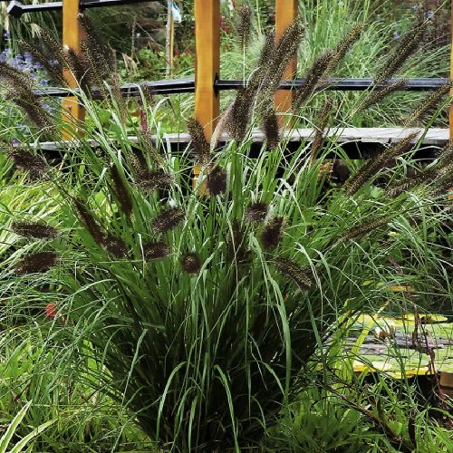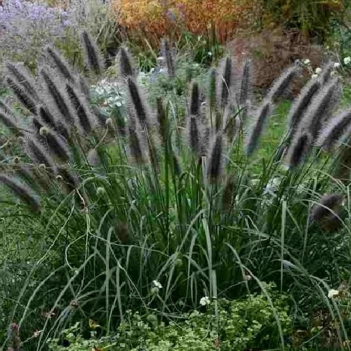 Пеннісетум Блек Магік. Зростає щільними, красивими, сильними кущиками з темно-зеленим листям. В кінці літа розквітають чорні дуже великі пухнасті колоски. Любить сонце можна півтінь. Висота 80-100 см.