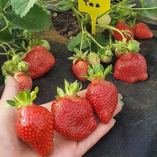 Теа - це пізній італійський сорт полуниці. З куща можна зібрати понад 1 кг ягід. Ягоди великі, в середньому 30-35 г, мають яскраво-червоний колір і привабливу конічну форму. Вони дуже соковиті та солодкі, а також мають гарний аромат. Полуниця Тея може вживатися у свіжому вигляді, заморожуватися, використовуватися для приготування компотів і джемів. Сорт Теа добре переносить транспортування і витримує тривалі терміни зберігання завдяки щільній шкірці, яка не дає змоги ягодам втрачати форму. Крім того, цей сорт стійкий до основних хвороб.