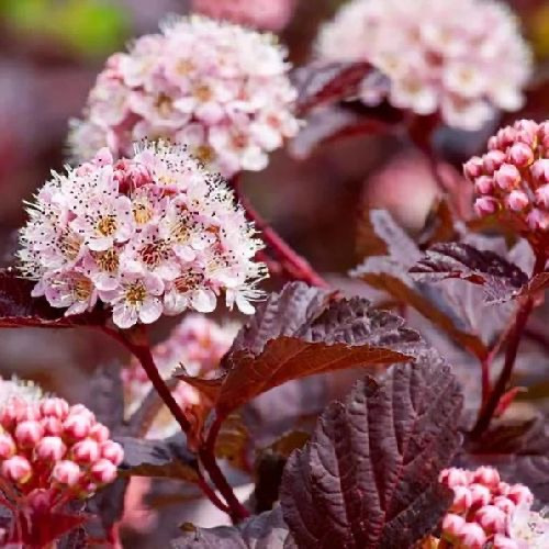 Квітки: рожево-білі, невеликі, зібрані в суцвіття, гарно контрастують з темно-червоним листям.