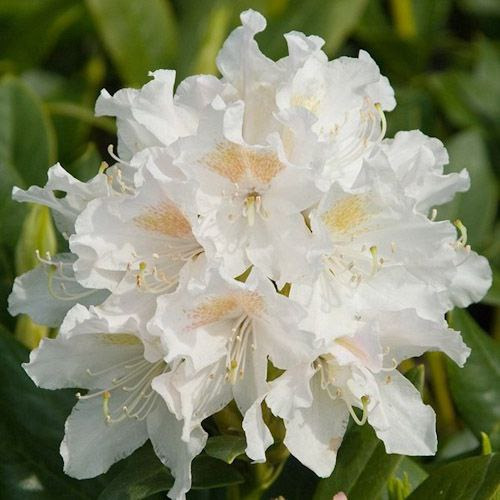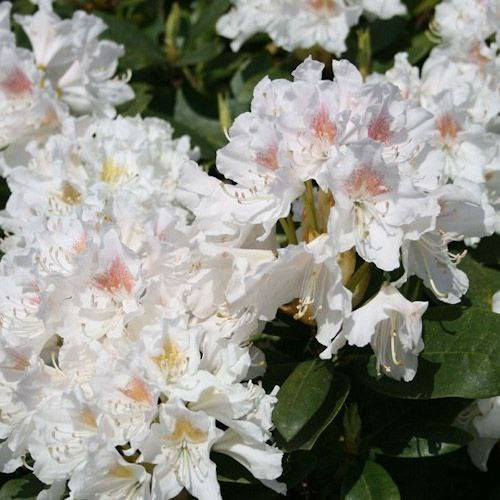 Рододендрон Cunningham's White (Каннінгемс Уайт) - красивоквітучий вічнозелений високодекоративний чагарник. Виведений ще в 1850 році, цей найбільш відомий і популярний сорт з гібридної групи рододендрона кавказького пройшов випробування часом. Висота дорослої рослини 2 м, діаметр крони 1,5 м. Кущ вічнозелений, сильногіллястий, розлогий. Листки темно-зелені, шкірясті, еліптичні, великі до 10-12 см. Квітки білі з блідо-фіолетовим і коричневими крапками на верхній пелюстці (до 5см), без запаху, зібрані в суцвіття по 7-8 штук. Цвіте на початку червня. Потребує посадки в кислу (рН від 4,5 до 6,5), пухку, добре дренований грунт, в захищених від вітру, тінистих і напівтінистих місцях, не виносить перезволоження.
