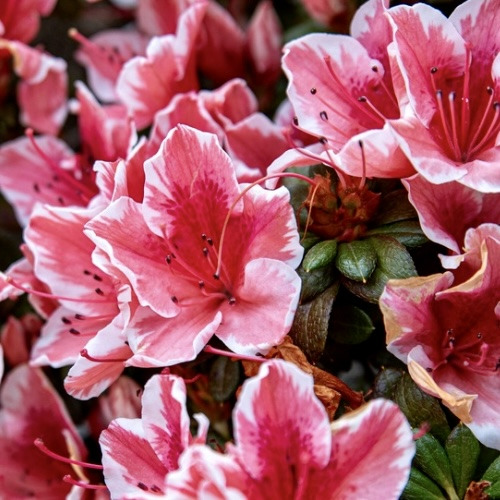 Азалія японська Karmesita Rosea – це надзвичайно декоративний сорт, який зачаровує рясним цвітінням та яскравим відтінком пелюсток. У травні компактний кущик буквально перетворюється на квіткову подушку, вкриваючись безліччю насичено-рожевих, майже малинових бутонів. Квітки зібрані настільки густо, що ніжне темно-зелене листя залишається майже непомітним.