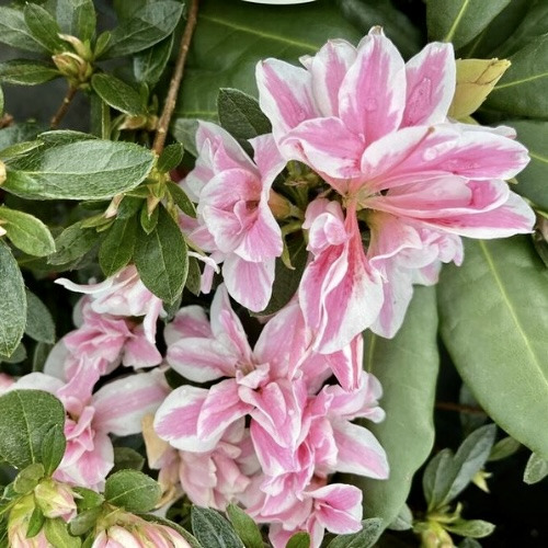 Листя еліптичне, блискуче, темно-зеленого кольору, зберігає декоративність упродовж року. Під час цвітіння кущ рясно вкривається глибокими рожевими бутонами з блідо-рожевими відтінками та білими краями пелюсток. У період масового розкриття квітів рослина перетворюється на яскравий акцент саду, створюючи ефектний контраст із зеленою кроною.