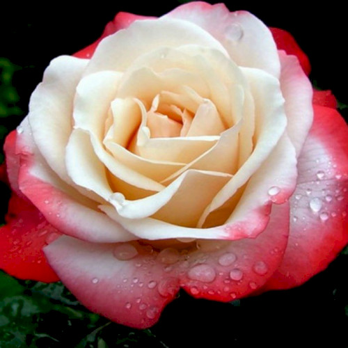 Чайно-гібридна троянда, забарвлення якої привертає увагу здалеку. Особливо популярна в Німеччині. Квітки великі, 10-11 см в діаметрі, чашоподібні, з закрученими білими пелюстками в центрі і яскраво вишнево-червоними по краях.