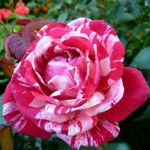 Бутони класичної форми розкриваються у великі, малиново-червоні квітки з білими смужками, майже без запаху, дуже ефектно виглядають в саду. Кущ сильнорослий, до 1,2 м у висоту, добре облистяний. Листя світло-зелене. Зимостійкий і сильнорослий сорт.