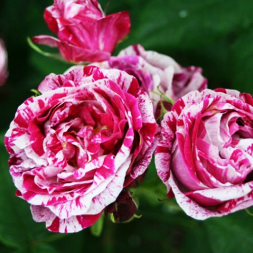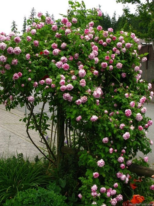 Квітки напівмахрові, з елегантними бутонами, але, розкрившись, показують тичинки. Вони блідо-рожеві, з малиновими смугами і плямами, нерівномірно розподіленими по пелюстках. На рослині немає двох схожих один на одного квіток. Вони з'являються по одному, або в кистях до 5 шт, рослина рясно квітне повторно. Листя велике, блідо-зелене. Це одна із самих здорових старовинних троянд, зростання сильно залежить від клімату: в Англії досягає 1 м, а у Франції вже 2-3 м.