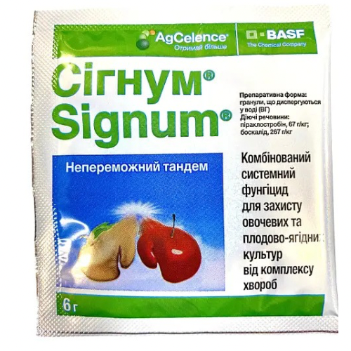 Сигнум - це високоефективний системний фунгіцид, призначений для захисту плодових і овочевих культур від широкого спектра захворювань. Комбінація двох активних речовин - піраклостробіну (67 г/кг) і боскаліду (267 г/кг) - забезпечує потужну профілактичну та лікувальну дію, запобігаючи розвитку патогенів на всіх стадіях їхнього росту.