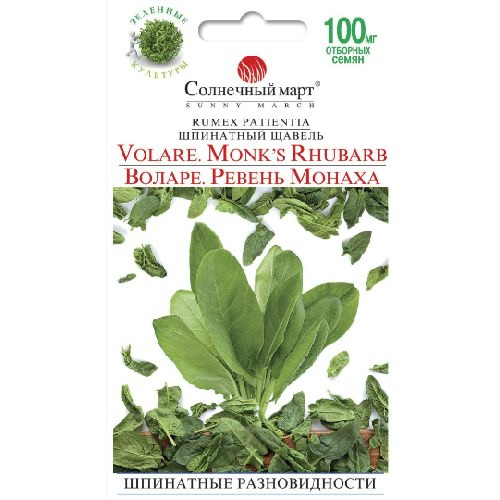 Шпинатний щавель Volare - найм'якіший зі всіх щавлів. Листя має м'який лимонний смак, злегка кислий, з текстурою, що ближче до шпинату, ніж інші щавлі. Шпинатний щавель, що відбувається з півдня Європи, високо цінувався стародавніми греками і римлянами і залишається французьким фаворитом сьогодні. Напровесні його часто вживають як листовий овоч, особливо у Волгарії, Македонії, Сербії та Румунії. Це перша морозостійка зелень, що з'являється напровесні, але тому Вам доведеться збирати врожай ще до того, як Ви посадите картоплю. Це найбільший щавель, який може зрости до 4 футів (120 см) на хорошому ґрунті. Листя можна збирати вже через 60 днів після сходу. Зрізайте, коли вони молоді та ніжні, всього від 10 до 15 см заввишки, і збирайте врожай протягом усього сезону. Видаляйте квітконоси, щоб рослини давали нове листя пізньої осені. Ця витривала багаторічна рослина вироблятиме зелень протягом 10 років. Ревень Монаха є відмінним замінником салату та шпинату в бутербродах та салатах, так як він довго не в'яне. Він найсмачніший приготованим, як «трав'яний овоч». Це фантастичний партнер для риби, телятини, яєць та картоплі.