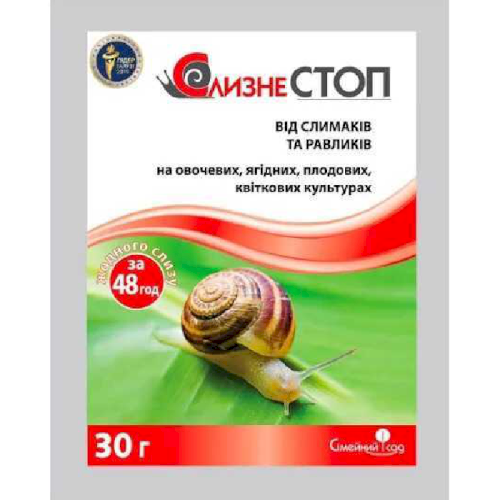 Слизнестоп 30 г - молюскоцид для боротьби зі слимаками та равликами у присадибних господарствах. Застосовується на овочевих, ягідних та плодових культурах.