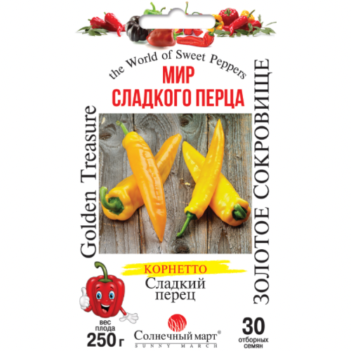 Золотий скарб – це старовинний італійський сорт солодкого перцю, який цінується за свій насичений смак, яскравий колір і універсальність у використанні. Довжина плодів досягає 20 см, ширина – близько 5 см, а середня маса становить 250-260 г. В процесі дозрівання (70-80 днів від пересадки) плоди змінюють колір від зеленого до насиченого золотисто-жовтого, а потім – до глибокого золотисто-оранжевого відтінку.