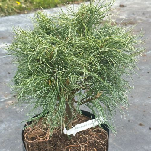 Сосна веймутова "Тіні Керлс" вічнозелене хвойне карликове деревце з кулястою формою крони. Крона дуже густа, компактна. Основна перевага цього нового сорту - незвичайна і дуже гарна хвоя, вона м'яка та хвиляста, сріблясто-синього кольору, зібрана в пучки по 5 шт.