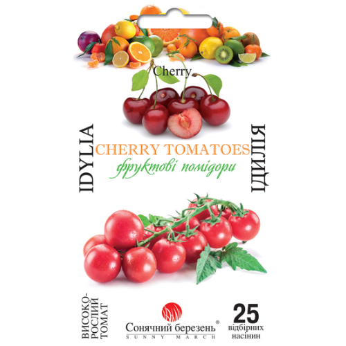 Помідор "Ідилія" – це унікальний сорт помідорів чері, який порадує кожного, хто цінує насичений смак та різноманітне кулінарне використання. Плоди цього сорту дрібні (біля 15 г, та 2-3 см у діаметрі), круглі та яскраво-червоні, з м’ясистою текстурою, що робить їх ідеальними для салатів. Рослини дуже високі та мають тонкі стебла, потребують опори, але ці зусилля більш ніж винагороджуються рясним урожаєм.