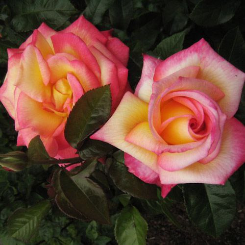 На фото троянди Хамелеон ви побачите квітку з жовтими або рожево-жовтими бутонами, іноді – з червоною облямівкою, що обрамляє краї пелюсток. Колір його може змінитися у різний час цвітіння, а й за різному освітленні.